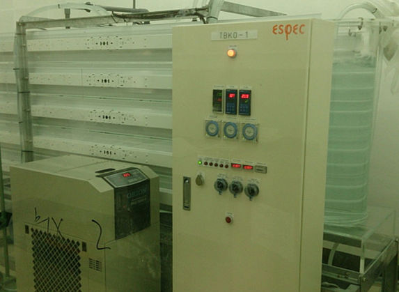藻類の光合成に、最適な環境にするため、光、水温、酸素、CO2濃度、養液をコントロールしています。エアレーションによる循環と光照射の効率化で光合成を促進できるように、培養タンクの形を工夫しました。