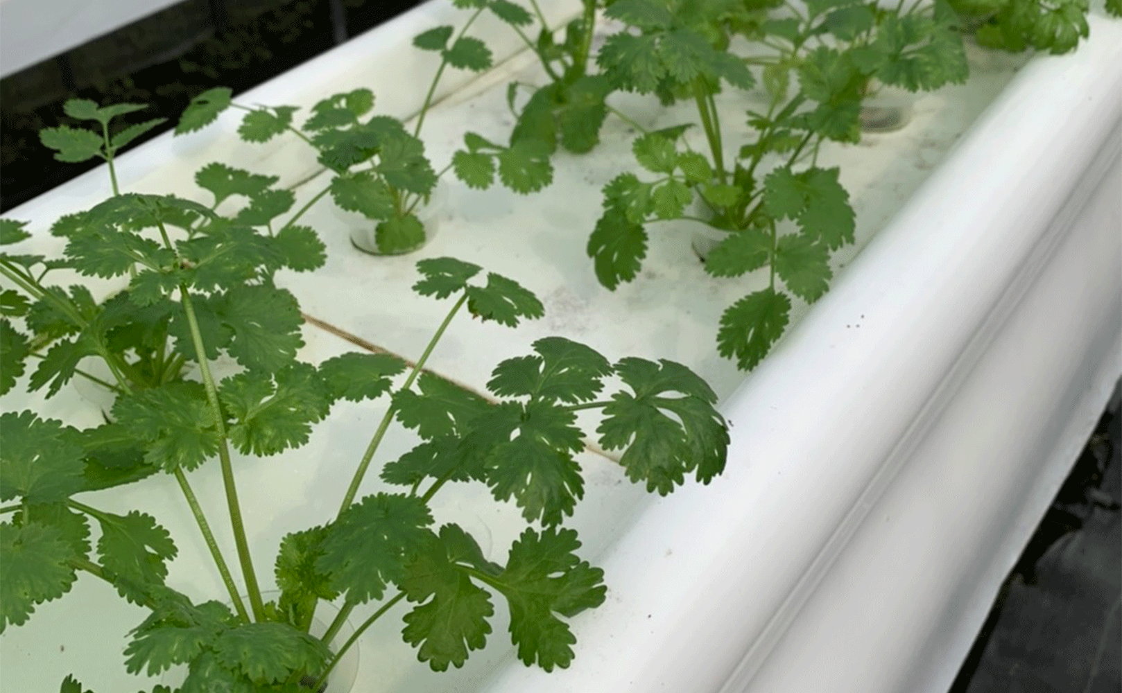 アクアポニックスとは植物の水耕栽培と魚の養殖を組み合わせた方法です。魚の水槽と植物の水耕栽培で使用する水は循環しており、魚の餌の食べ残しや排せつ物を肥料として植物に吸収させています。化学肥料の使用を減らし、人と環境に優しい植物の生産に繋がっています。