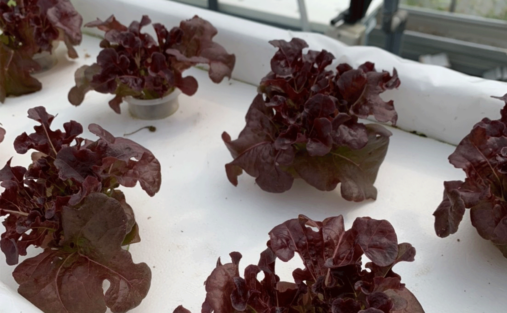 エスペック和泉ラボではビニールハウス内で魚の養殖と野菜の水耕栽培をしています。